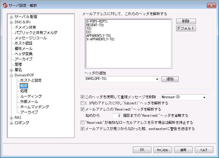 通常は”Received”メッセージのエンベロープでのみで検出される受信者情報を、メッセージヘッダに保存することが可能です。その結果、メールメッセージの解析処理において、単にヘッダを検査するだけで実際の受信者アドレスを収集することができるようになります。メールメッセージ内で検出される"received"ヘッダの全部の有効なアドレスを解析する場合、このチェックボックスをクリックしてください。
