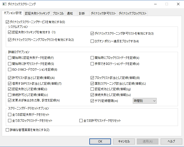 ダイナミックスクリーニングのブロックリストデータ全てをクリアするにはこのチェックボックスをクリックします。適用又はOKをクリックすると初期化が行われます。
