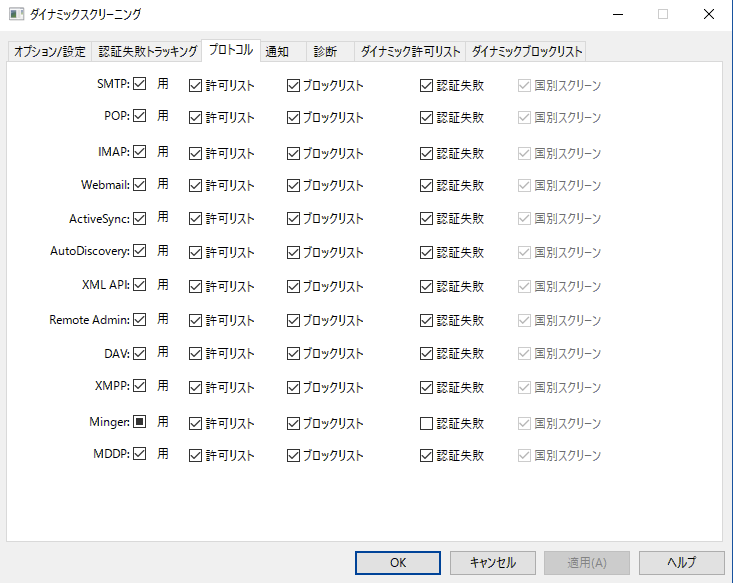 デフォルトでは、ダイナミックスクリーニングサービスはSMTP、POP、IMAP、Webmail、ActiveSync、AutoDiscovery、管理API、MDaemonリモート管理。 WebDAVとCalDAV、XMPP、およびMingerプロトコルに適用されます。プロトコルタブでは、インバウンドセッションにおける ダイナミック除外リスト や ダイナミックブロックリスト のチェックや国別スクリーニング が適用された認証失敗のログの対象とするプロトコルを選択できます。 デフォルトでは、このダイアログのすべてのオプションはMinger認証失敗を除いて有効になっています。