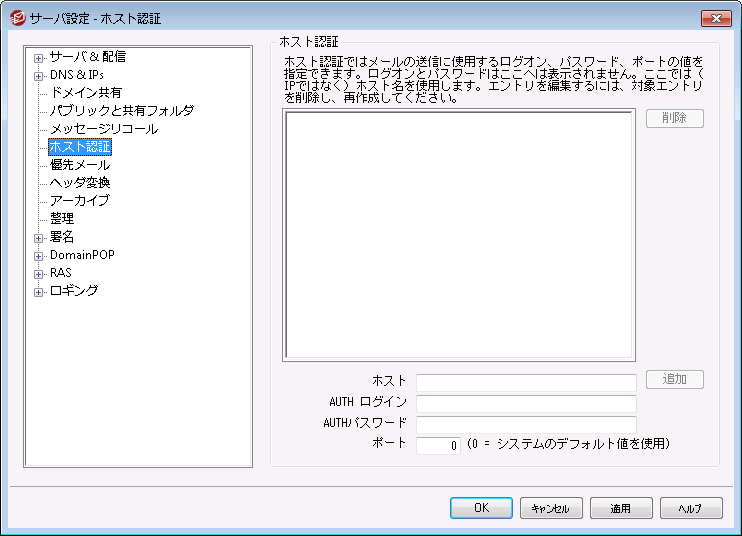 この画面では、全てのホストに対するログオン、パスワード、ポートの設定が行えます。MDaemonがホストへのSMTPによるメール送信時、ここで指定した認証情報を使用します。ここでの認証情報は代替手段であり、個別の認証情報が使用できない場合にのみ使われるという点にご注意下さい。例えば、アカウントエディタの転送オプションやゲートウェイマネージャのデキューオプションといった機能でログオン情報を設定していた場合、認証情報はそちらが優先して使用されます。この機能は(IPアドレスではなく)ホスト名でのみ機能します。