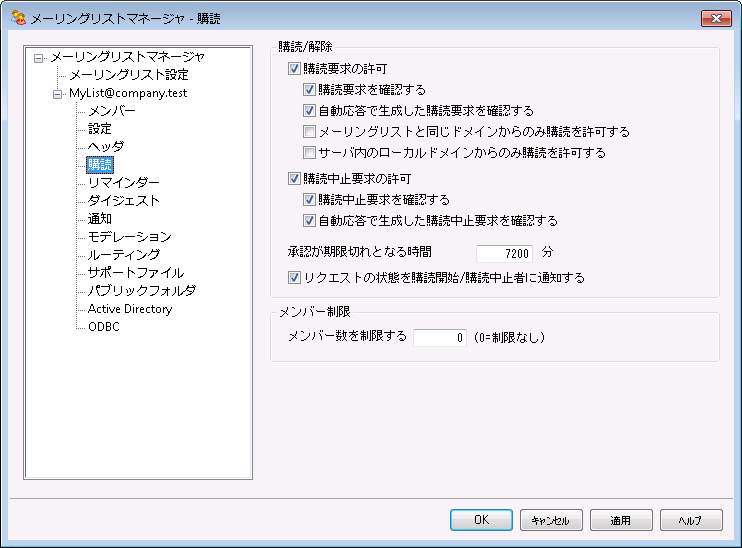 このオプションで特定形式のメールや自動応答機能で購読要求を許可するかどうかを指定します。詳細についてはメーリングリストの購読を参照して下さい。