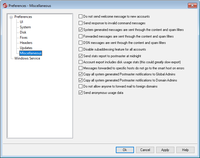 デフォルトで、Postmaster宛にシステムが生成する通知メールは グローバル管理者へも送信されます。 グローバル管理者は、キューサマリレポート、統計レポート、リリースノート、(全ドメインの)No Such User、ディスクエラー通知、全てのドメインのアカウントの凍結や無効化通知(ドメイン管理者と同様、アカウントの凍結解除や再有効化に使用できます)、ライセンスの警告やテストバージョンの有効期限、スパムサマリレポート、等を受信します。グローバル管理者がこうした通知を受け取らないようにするには、この設定を無効にしてください。