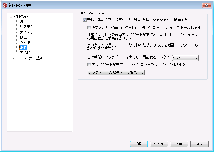 自動アップデートは最新バージョンを見つけるとすぐにダウンロードされ、\MDaemon\Updates フォルダへ格納されますが、インストールはここで指定した時間まで実行されません。MDaemonがインストールされたサーバーはアップデートを実行する度に再起動されます。このオプションはデフォルトで2 AMに設定されています。