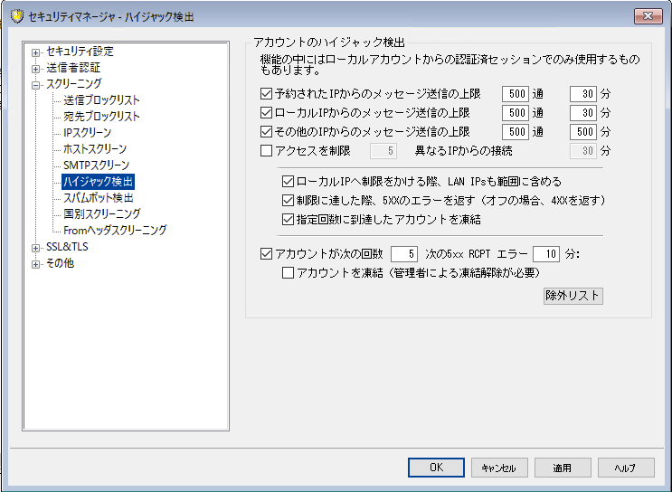 この画面では、MDaemonアカウントでハイジャックされた可能性のあるアカウントを検出し、自動でメール送信を防止する機能を有効化できます。例えば、何らかの方法でスパム送信者がアカウントのメールアドレスとパスワードを入手した場合、この機能を使う事でスパム送信者が対象アカウントを使ってMDaemonサーバーからメール送信するのを防ぐことができます。接続しているIPアドレスを元に、1分間で送信できる最大メール数を指定する事ができ、この制限に到達したアカウントを無効化する事もできます。ここでは除外リストを使用する事もでき、こうした制限から除外することもできます。アカウントのハイジャック検出はデフォルトで有効です。