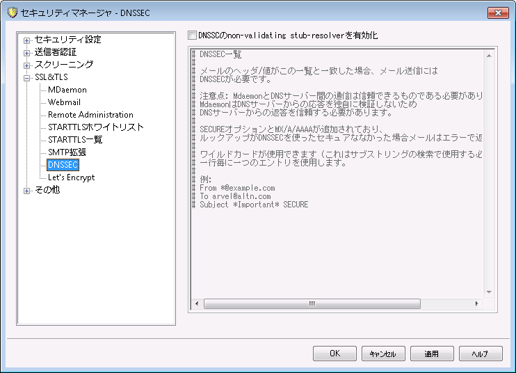有効化すると、DNSSECサービスは選択条件にマッチしたメールに対してのみ適用されます。DNSSECサービスはメール毎に「要求」したり「必須」としたりできます。DNSSEC画面で「ヘッダ値」の組み合わせを選択するだけで、MDaemonはDNSの問合せの際条件にマッチしたメールにのみDNSSECサービスを要求します。「必須」としている場合で認証データを含むDNSの応答に失敗すると、メールは送信者へ返されます。「要求」している場合はDNSSECサービスで失敗した場合でも何も起こりません。ただし、特定のメールに対してDNSSECを必須とする場合は、ヘッダ値の組み合わせへ「SECURE」を追加してください。(例. To *@example.net SECURE)これらのメッセージで認証データを含むDNSの応答に失敗すると、メールは送信者へ返されます。注意点: DNSSECルックアップには従来よりも時間やリソースが必要となり、また、DNSSECは全てのサーバーで対応しているわけではないため、MDaemonは全てのメール配信へDNSSECを適用するデフォルト設定にはなっていません。ただし、必要に応じ、設定ファイルの中に「To *」などの行を一行追加する事で、全ての送信メールでDNSSECの利用を必須とする事ができます。