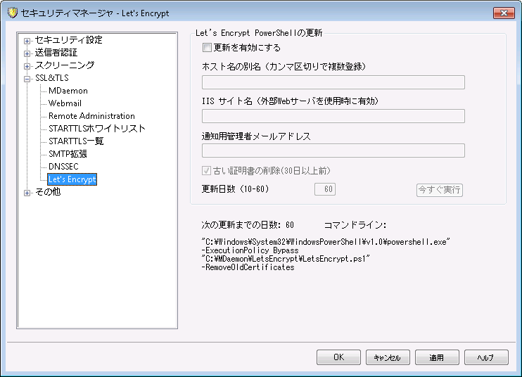 Let's EncryptスクリプトでSSL/TLSの証明書の自動生成や更新を行うにはこのチェックボックスをクリックします。証明書は更新日数により10~60日毎に更新されます。