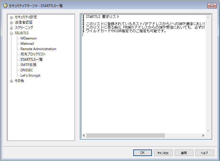 ここでは、サーバーとでメールの送受信を行うのにSTARTTLS拡張を必須とするホストやIP、MAIL FROMアドレスを指定します。