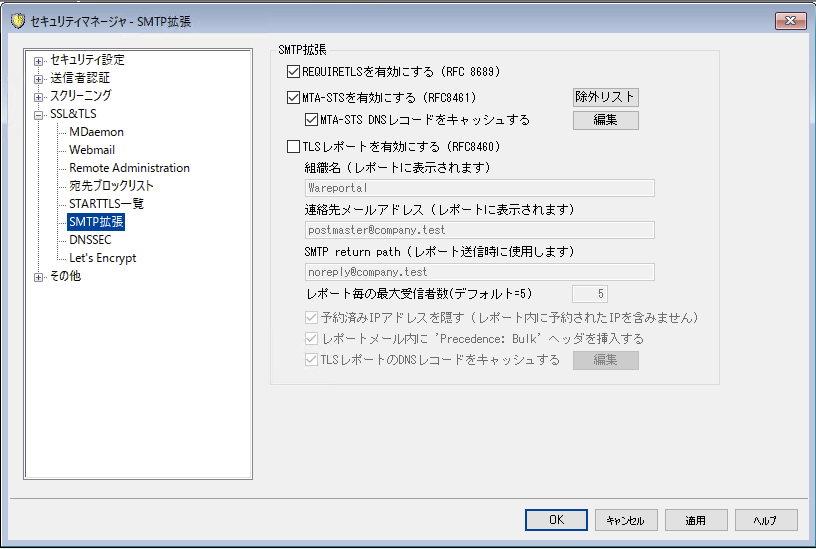 RequireTLSにはMXレコードホストのDNSSECによるルックアップか、MXがMTA-STSによる検証が必要です。 DNSSECで、DNSSECサービスのルックアップ用パラメータを指定する事で DNSSECの設定 が行えます。MDaemonの IPキャッシュ にはDNSSEC処理を許可するオプションがあり、DNSSEC関連の説明が MX Hostsファイルの最初にも記載されています。最後に、DNSSECは正しく設定されたDNSサーバーが必要ですが、これはこのヘルプファイルの説明の対象外となります。