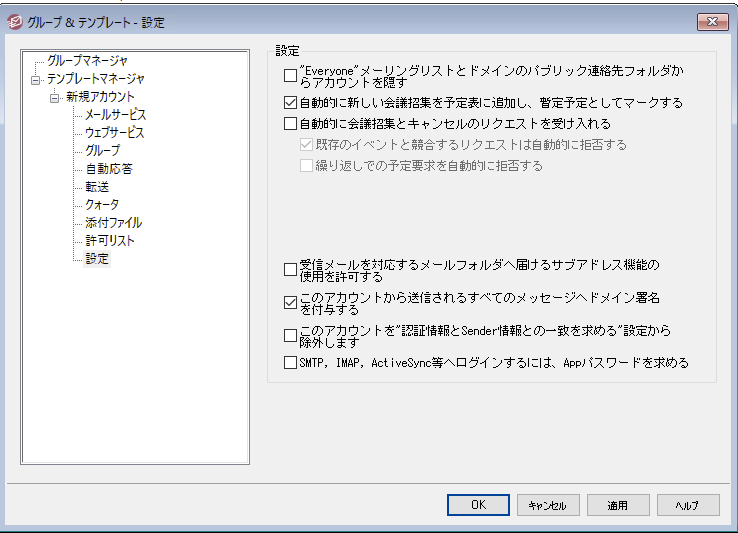 このテンプレートを使用しているアカウントがSMTP, IMAP, ActiveSync, それ以外のメールサービスへのログインを行うのに、メーラー側でAppパスワードを必須とする場合はこのオプションをクリックします。アカウントの通常のは、WebmailやRemote Adminへのログインにパスワードは必要です。