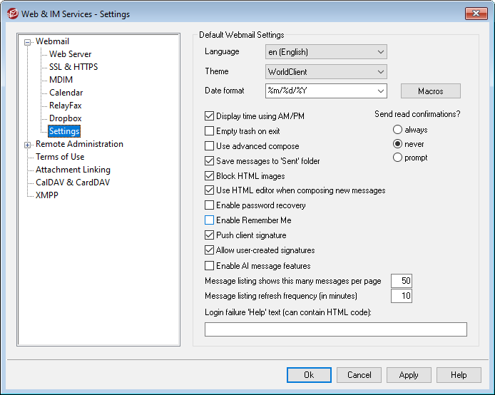 ユーザがHTML形式でメッセージを編集できるようにする場合は、このチェックボックスを選択してください。ユーザはWebmailのオプション » 作成 で、この設定を変更することができます。