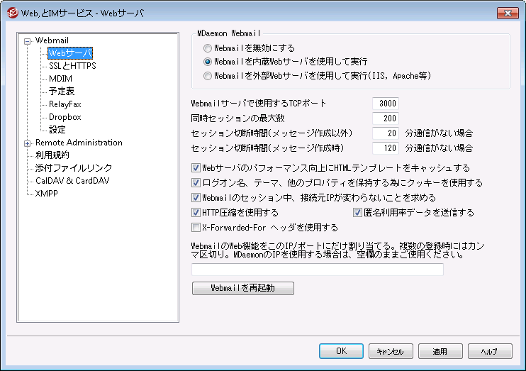 このボタンをクリックすると、Webmail サーバが再起動されます。注意:Webmailのポート設定を変更した時は、変更を反映するためにWebmailを再起動する必要があります。