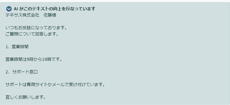 「ニュアンス」「スタンス」「態度」「文章の長さ」をそれぞれ選択し「AIによるテキストの推敲」をクリックすると、メール本文に続いて、AIが作成した本文が表示されます。