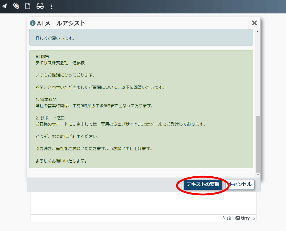 AI応答内が、AIが変換したメール本文です。この内容で書き換えたい場合は、「テキストの変換」をクリックします。