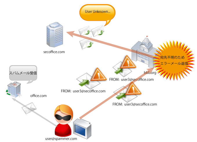 - これにより、送信先が存在すれば、そのメールアドレスへのスパムメールを、存在しなければ、返信先として指定したメールアドレスへ”エラー返信”としてスパムメールを送信することができることとなります。