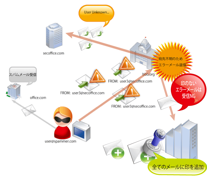 MDaemonを経由してインターネット側へ送信される全てのメールに対して、自身が作成した”印(しるし)”を付けて、送信します。もし、返信されてきたメールの中に、その”印”がなければ、社内から”正規に”送信されたメールへの”エラー返信メールでない”とみなし、そのメールの受信を拒否します。