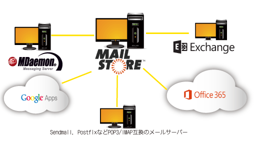 MailStore Serverから既存のメールサーバへIMAPやPOP3などでアクセスし、メールを取得します。IMAPやPOPでアクセスできるメールサーバーであれば既存環境を変えずにメールアーカイブを行えます。