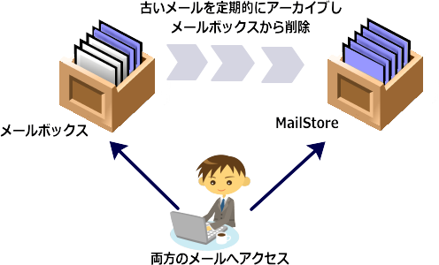 MailStoreではメールをアーカイブすると同時に、指定したルールに従ってメールボックス上の古いメールを自動的に削除する事ができます。これにより、メールボックスやメールサーバーのディスク容量を一定に保つ事ができます。