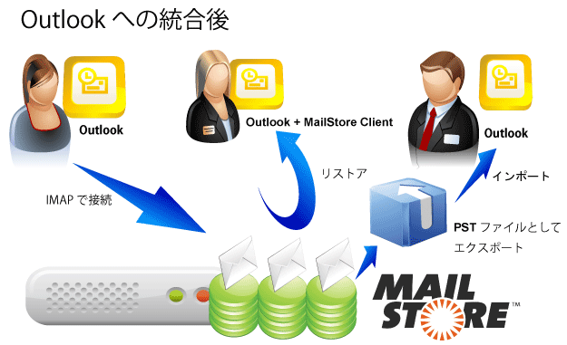 MailStoreならOutlookやThunderbirdといったメールクライアントで直接アーカイブやエクスポートができますので、古いメールデータへのアクセスを諦めることなく、メールクライアントの移行が行えます。