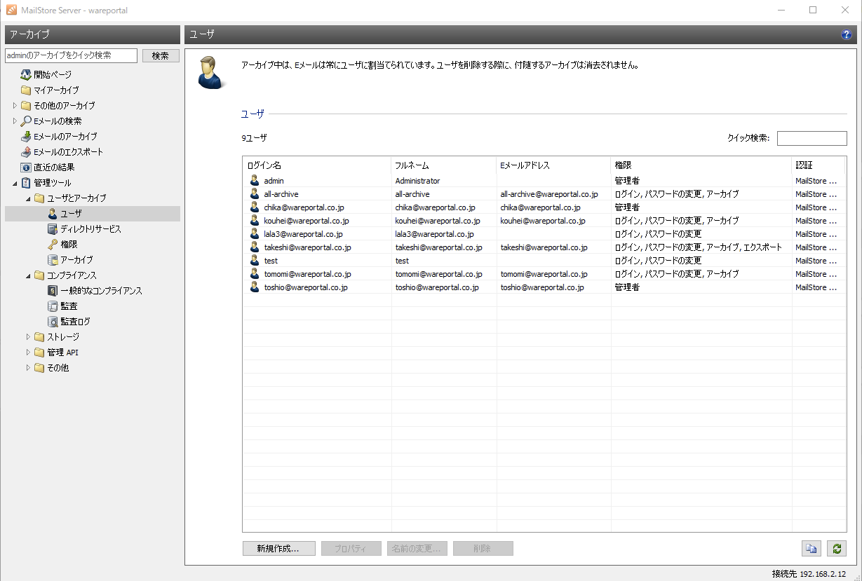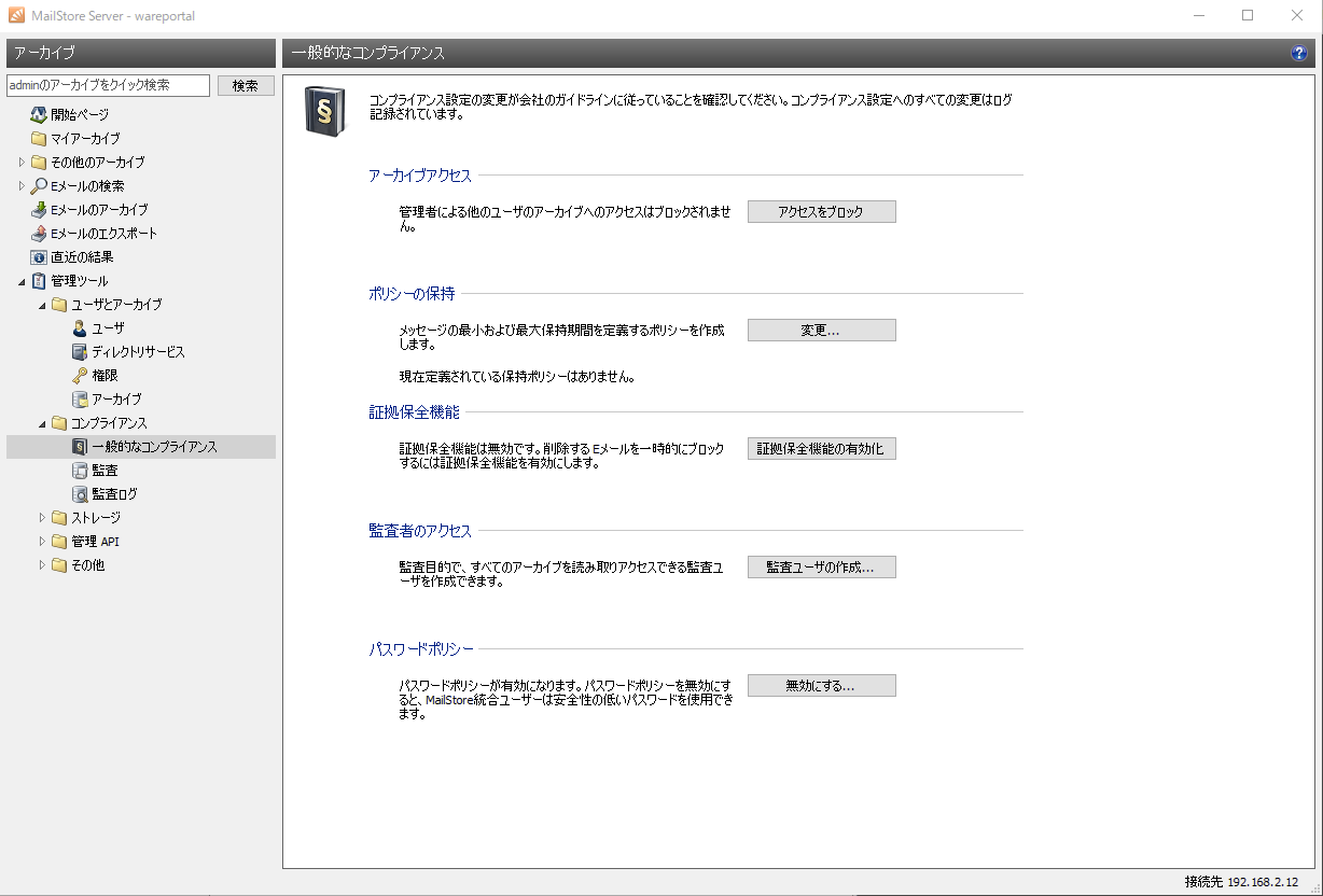 MailStoreの管理は全てMailStore Clientから行います。ユーザー権限に応じたメニューが表示されます。起動直後のダッシュボードでは、サーバーステータス等の情報も確認できます。