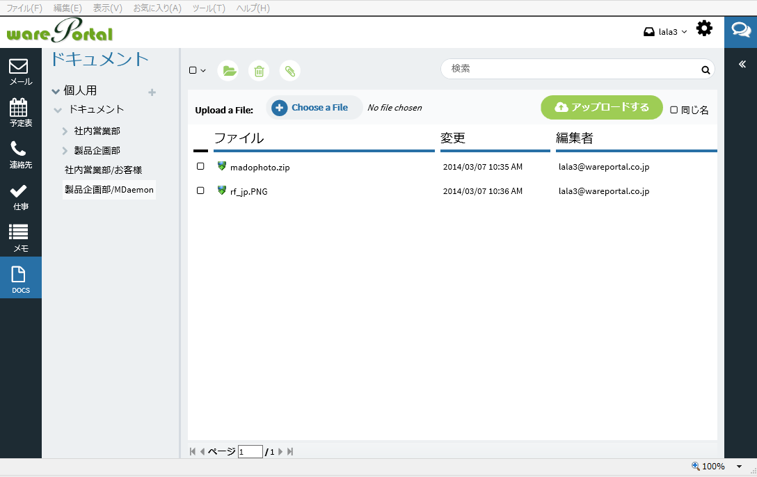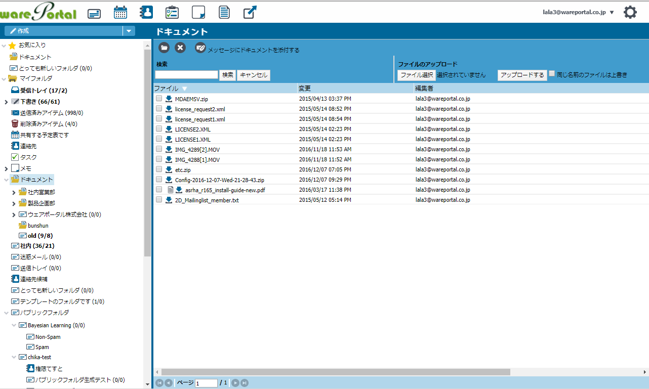 ファイルのアップロードはもちろん、他のユーザーと共有したり、メールへ添付したりできます。添付ファイルからファイルを取り出しURLを代わりに挿入する添付ファイル機能とも連携します。