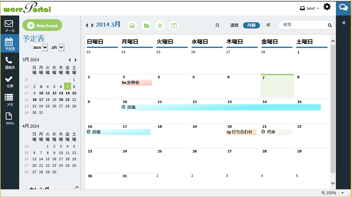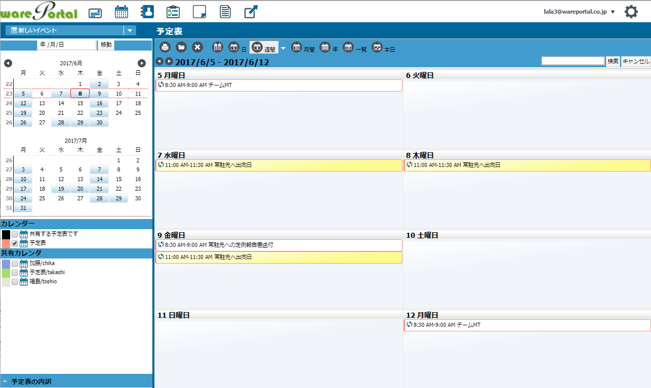 日・週・月・年の単位で表示が行える予定表機能も搭載されており、個人や共有予定を簡単に把握できます。表示単位は、ボタンをクリックするだけで簡単に切り替えられます。また、週間表示の場合には、7日間表示と5日間表示を必要に応じて選択できます。