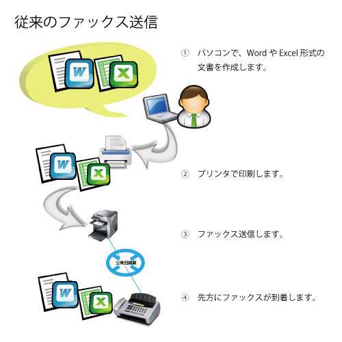 WORDやEXCELなどの、Windowsアプリケーションで作成した文書ファイルを、印刷と同様のオペレーションで気軽にFAX送信できます。