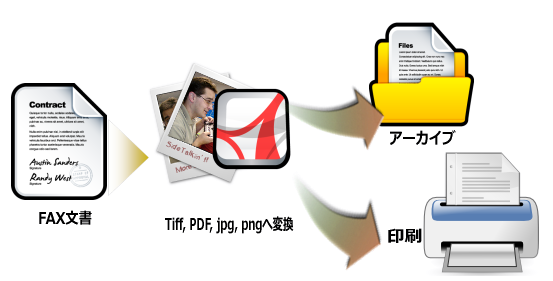 受信したFAX文書をTIF、JPG、GIF、BMP、PNG、PDFのうち任意のフォーマットへ変換し、指定したフォルダへ保存する事ができます。同時に、メールの添付ファイルとして各ユーザへ配信することもできます。