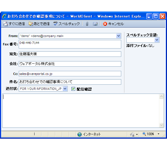 MDaemonに標準パッケージされているウェブメールWorldClientから、FAXの送信も行えます。社外からも専用ツールなしで、気軽にFAXが送信できます。