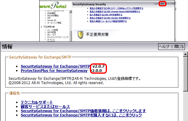 お使いの製品バージョンを確認するには、管理画面右上の「情報」ボタンをクリックします。情報表示ウィンドウが表示され、その中に、ご利用中のバージョンが記載されています。
