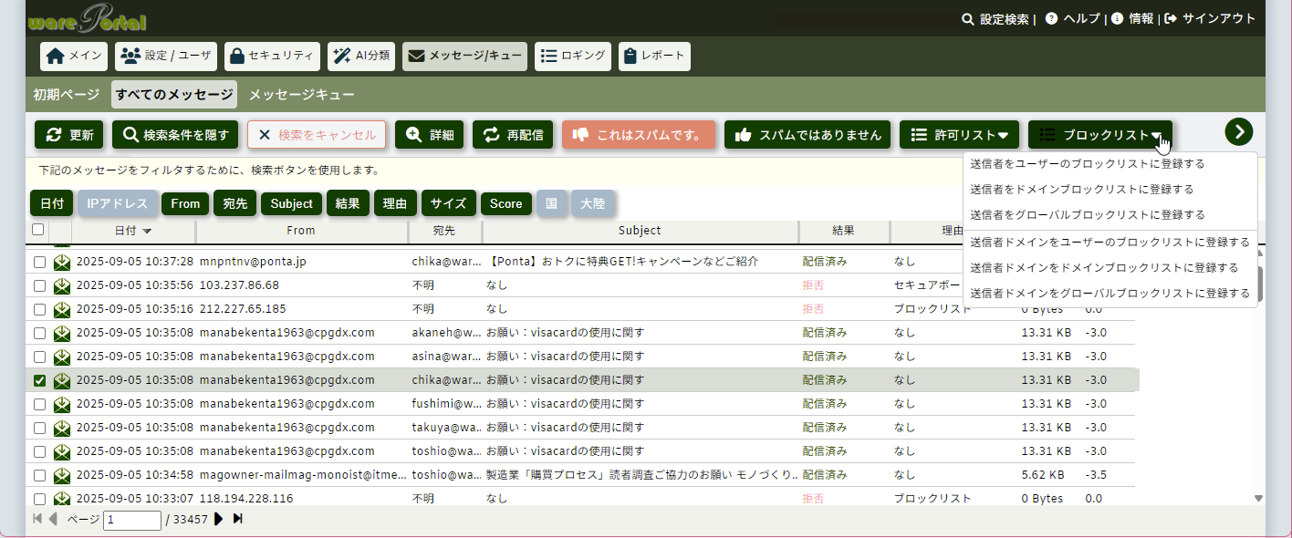 管理者や、エンドユーザーが、送受信メールのログや隔離されたメールの一覧画面から、対象のメールを選択し、ブロックリストへ登録する事ができます。このブロックリストは全体またはドメイン単位で使用できます。