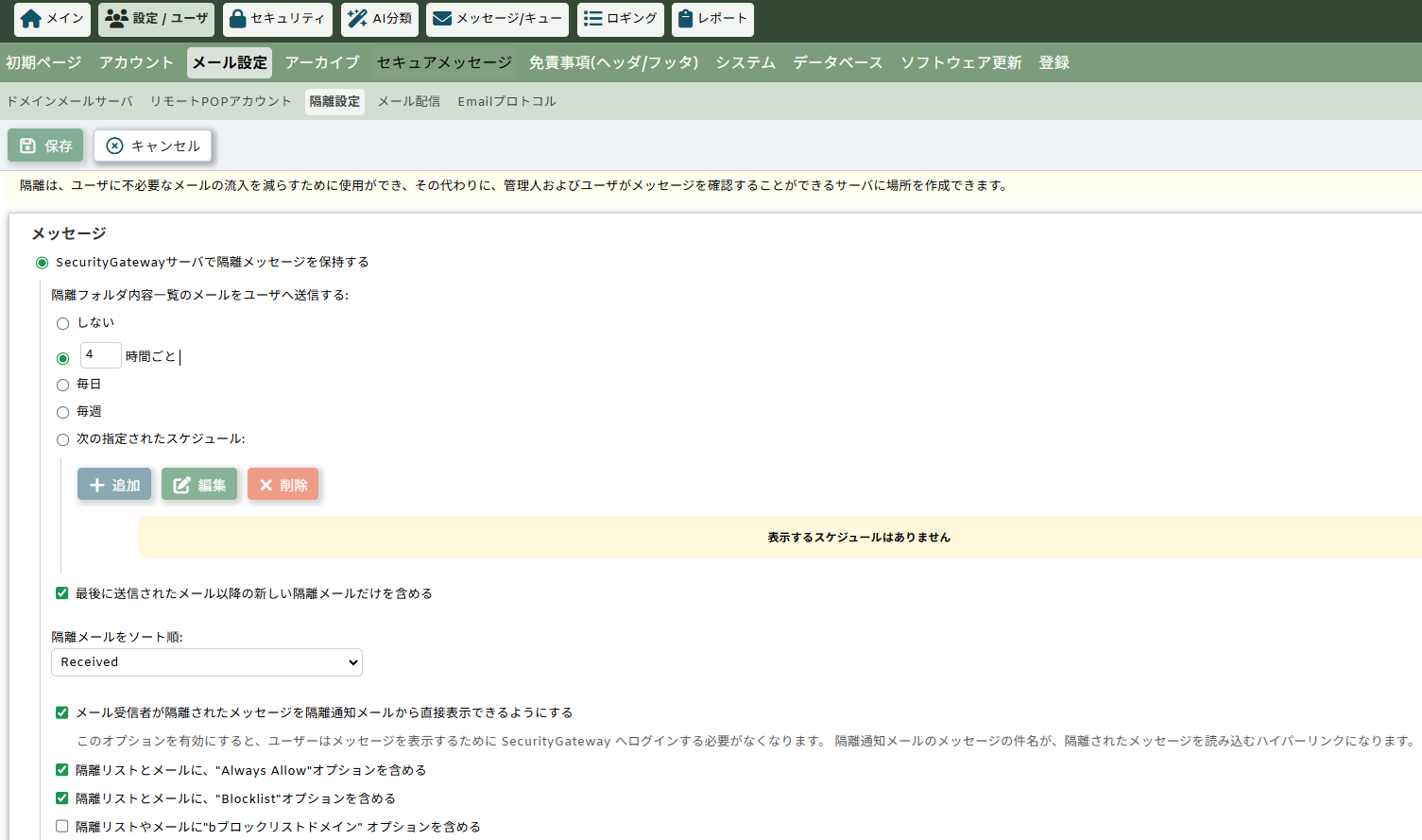 隔離通知メールは、SecurityGatewayの管理画面にログイン後、[設定/ユーザ]>[メール設定]>[隔離設定]で変更できます。