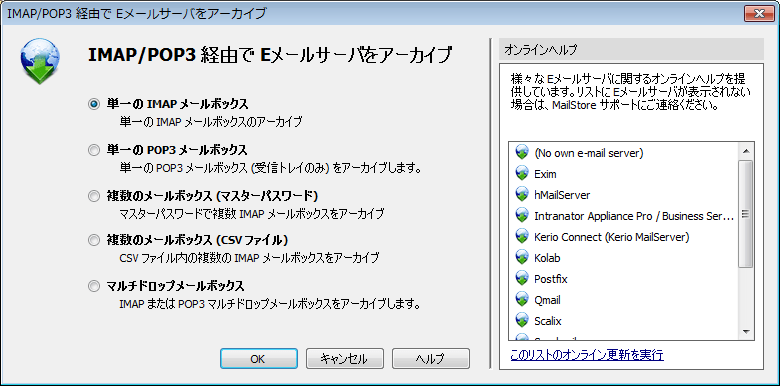 ヒント: メールサーバ毎の実装ガイドを開くには、オンラインヘルプ内の各エントリをクリックします。