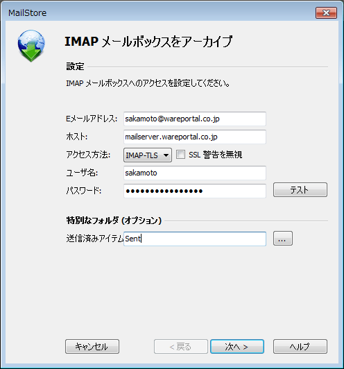IMAP-TLSとIMAP-SSLプロトコルの場合のみ: SSLのセキュリティ警告を無視する場合は「SSL警告を無視」オプションをチェックします。一般的には、サーバーで非公式な証明書が使われているとこれらの警告が表示されます。