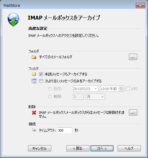 - 必要に応じて、アーカイブするフォルダの一覧や(IMAPでのみ利用可能)、削除ルール(IMAPでのみ利用可能)、フィルタ(IMAPでのみ利用可能)、秒単位によるタイムアウト値を調整します。タイムアウト値は特定のケースで調整が必要な場合があります。(例えば、非常に遅いサーバに接続する場合)