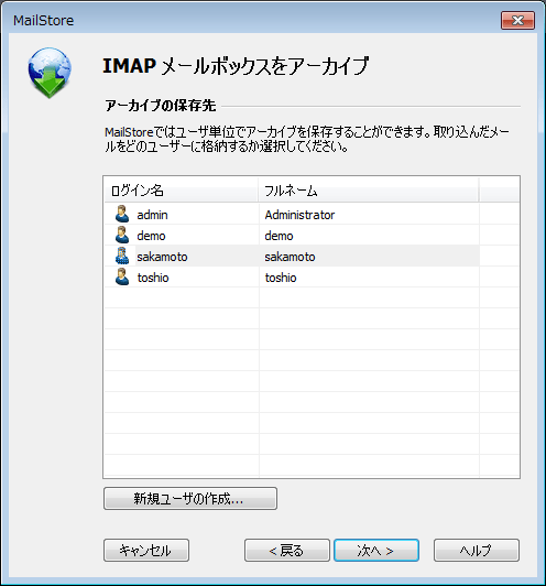 - 管理者としてMailStore Serverへログオンしている場合は、次のステップでターゲットのアーカイブを指定することができます。このメールボックスのアーカイブ先となる対象のユーザーを選択します。
