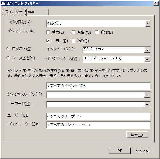 - 「ソースごと」を選択し、イベント ソースとして「MailStore Server Auditing」にチェックを入れます。