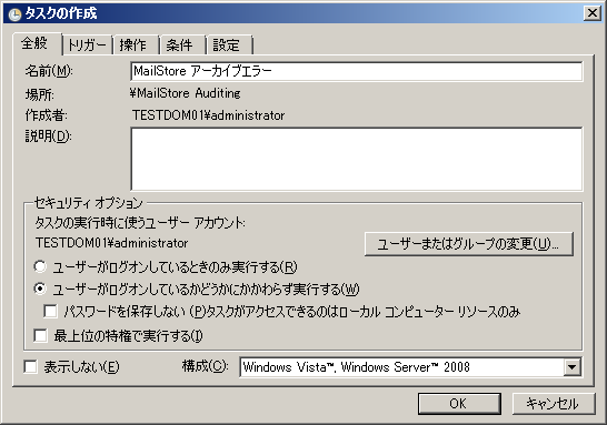 - 「構成」にて、少なくとも「Windows Vista, Windows Serer 2008」以上を選択します。これより古いタイプを選択すると、イベント発生をトリガしたタスクを構成することができません。