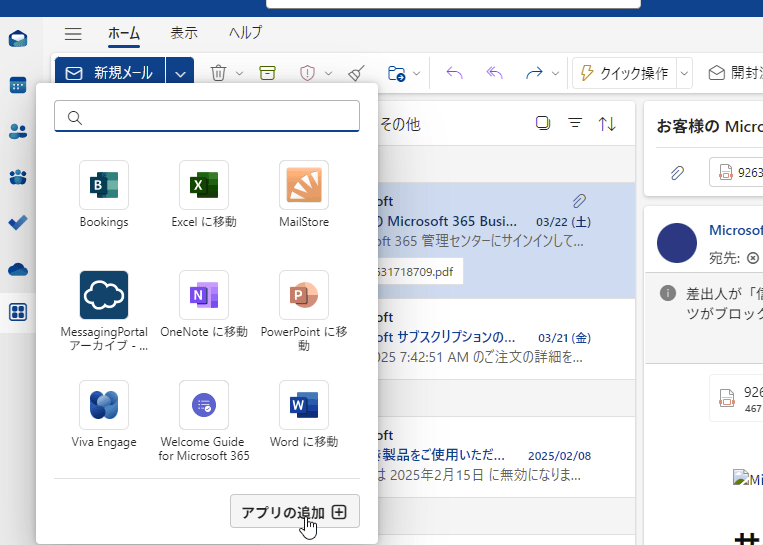 エンドユーザーがWebからOutlookへログインすると、アップロードしたアプリをOutlookへ追加できるようになります。