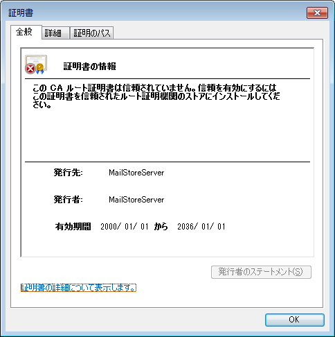 MailStore Serverのインストール処理の中で、MailStoreコンポネントで暗号化通信が確立した際使用するSSL証明書が生成されます。証明書は、サーバー名を MailStoreServer としたもので、信頼できる第3者の認証局 (CA)から発行されたものではないため、クライアント側からは信頼できない証明書として扱われます。
