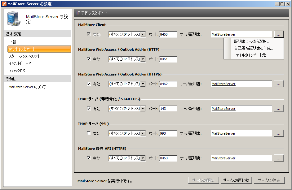 MailStore Serverのインストール処理の中で、サーバー名を MailStoreServer とした自己署名SSL証明書が生成されます。
