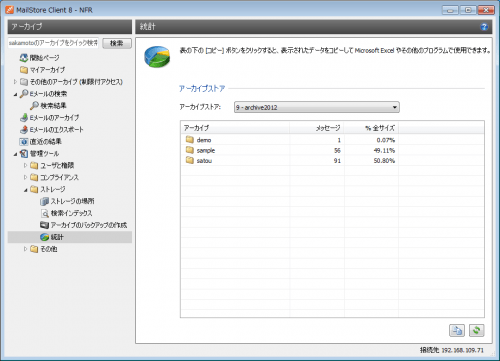アプリケーションウィンドウの下部にあるコピー機能を使うと、表示されている情報が例えば、Microsoft Excelなど、他のアプリケーション用にコピーできます。ファイルグループに関する一般的な情報は「ストレージの場所の管理」を参照して下さい。