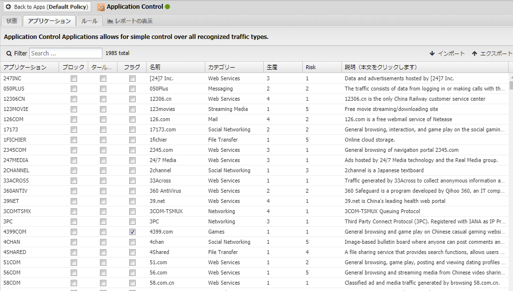 ネットワークトラフィックを、私的なビデオ再生やゲームなどで圧迫してしまう可能性はありませんか?アプリケーションコントロール機能では、稼働しているアプリケーションを、プロトコル等で判定し、ルールに応じてブロックしたり許可したりする事ができます。350以上のアプリケーションを自動判定できます。