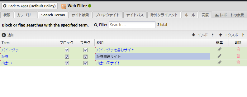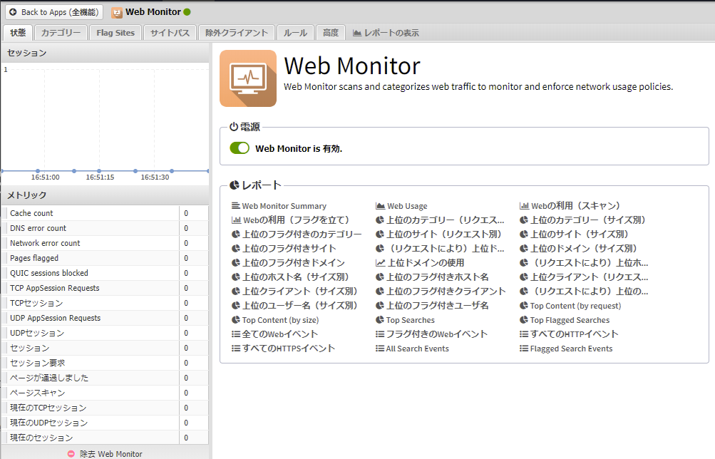 アプリケーションコントロールはアプリケーションを元にトラフィックを制御しますが、これと同様に、ウェブサイトの種類やURLによってトラフィックの許可や拒否を行うのがウェブフィルター機能です。現時点でも、79のカテゴリに、7億を超えるドメイン、35憶を超えるURLが登録済ですが、更に精度を向上させるため、ウェブモニター機能も併せて使用できます。閲覧しているウェブサイトのカテゴライズはもちろん、不適切と思われるサイトのブロックや状況把握がタイムリーに行えます。